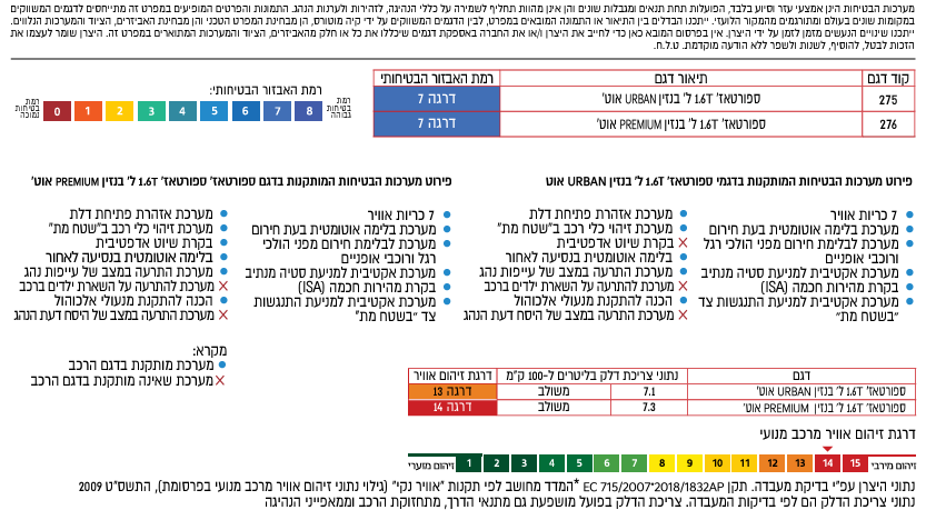 קיה ספורטאז' 1.6 טורבו Premium מציבה רף גבוה בתחום הבטיחות. הרכב מצויד ב-7 כריות אוויר, כולל כרית אוויר מרכזית ייחודית, ומערכות בטיחות מתקדמות כגון מערכת למניעת התנגשות קדמית (FCA) הכוללת בלימה בעת פניה שמאלה בצומת, מערכת אקטיבית לזיהוי רכבים בשטח מת (BCA), ומערכת סיוע לשמירה על נתיב הנסיעה (LKA). בנוסף, תיהנו מחיישני חניה קדמיים ואחוריים, מצלמה אחורית, ומערכת התרעה בעת פתיחת דלת (SEW). כל אלה מעניקים לכם ולמשפחתכם שקט נפשי מלא בכל נסיעה.